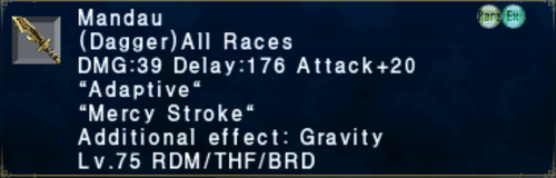 | Hidden Effect Trigger with the latent adding +5 Accuracy and +16 Attack While under 1000 TP and while using Weapon skills. A Solid main hand option Held back by holding TP. | |